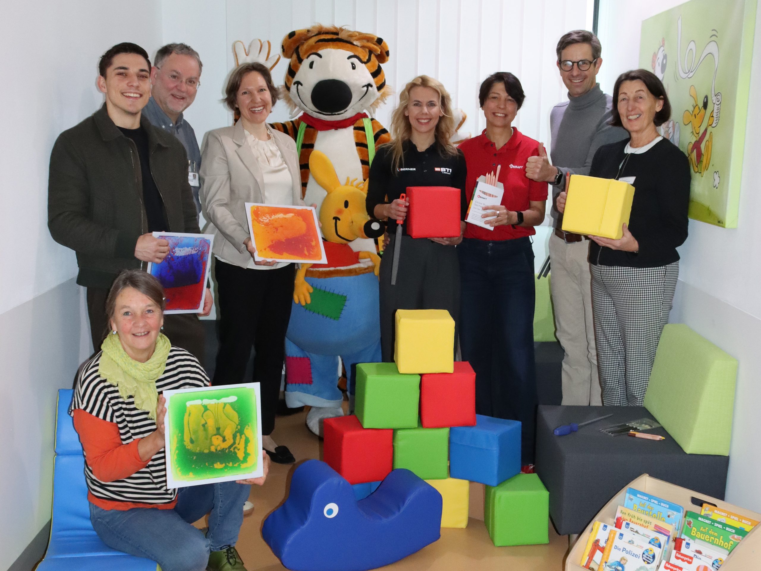 Der neu gestaltete Wartebereich ist nun ein Rückzugsort, in dem Eltern und ihre Kinder sich entspannt aufhalten können. „Dieses tolle Projekt ist ein Beispiel dafür, dass diese Region zusammenhält und dass große Unternehmen mit Herz und Hand überlegen, wie man Engagement nutzbringend für andere zusammenbringen kann. Das Ergebnis und der Einsatz für junge Patientinnen und Patienten hier, ist einfach super“, meint Isabell Rathgeb, die Vorsitzende des beuteltigerstarken Fördervereins der Kinderklinik und darüber sind sich der Tiger, und alle anderen Beschenkten sehr sehr einig.